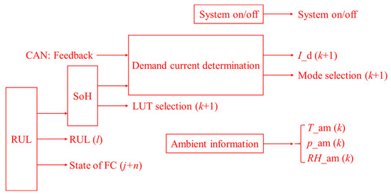 - This work designed a novel control framework including ECU, RUL, SoH, and FCU modules. This control framework introduces the results of the SoH estimation and RUL prediction to the ECU and FCU. The desired power of the stack was obtained, which was used as the real-time desired power of the PEMFC system by synthesizing the RUL, SoH, and ECU information of the stack.