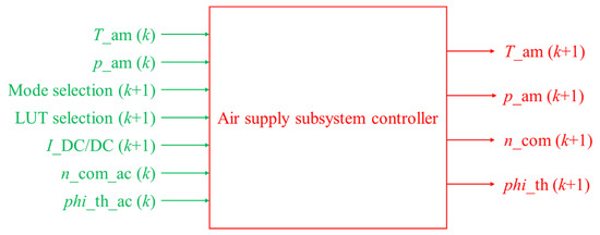 The air supply subsystem controller shown in Figure 13 provides the ambient temperature and pressure, compressor speed, and throttle opening to the CAN Out and air supply subsystem module.