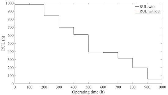 The prediction results of the RUL with and without the proposed control framework are shown in Figure 17. It can be seen that the prediction results of the RUL could only be obtained by applying the proposed control framework, while there was no information of the RUL without the proposed control framework. The prediction of RUL started at 200 h and operated every 100 h. Moreover, the prediction results of the RUL decided the estimation duration of the SoH.