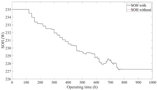 The estimation results of the SoH with and without the proposed control framework are shown in Figure 18. It can be seen that the estimation of the SoH could only be obtained by applying the proposed control framework, while there was no information of the SoH without the proposed control framework. The estimation of SoH started at 100 h, and its duration was 20 h in the period of 0–500 h, 10 h in the period of 500 h–700 h, and 5 h in the period above 700 h, respectively.