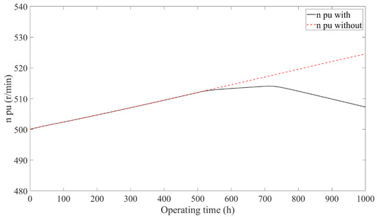 The results of the pump speed with and without the proposed control framework are shown in Figure 19. The pump speed with/without the proposed control framework tended to increase because with the increase in the stack operating time, the stack performance degraded, which manifested in the gradual increase in the stack heat production pulling the same amount of current. Therefore, the heat dissipation needed to be increased to maintain the stack temperature in the appropriate range by increasing the pump speed. Specifically, the pump speed with the proposed control framework rose slowly from 500 r/min to 514 r/min at 0~712.86 h and fell slowly from 514 r/min to 507 r/min at 712.86~1000 h, while that without the proposed control framework rose from 500 r/min to 524 r/min at 0~1000 h. The control strategy without the proposed control framework simply increased the pump speed to realize the increase in heat dissipation.
