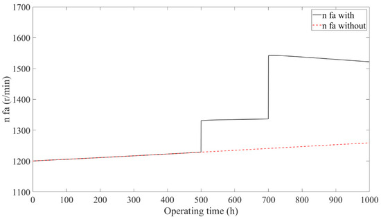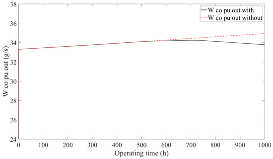 The results of the fan speed with and without the proposed control framework are shown in Figure 20. The fan speed with/without the proposed control framework tended to increase because with the increase in the stack operating time, the stack performance degraded, which manifested in the gradual increase in the stack heat production pulling the same amount of current. Therefore, the heat dissipation needed to be increased to maintain the stack temperature in the appropriate range by increasing the pump speed. Specifically, the fan speed with the proposed control framework slowly increased from 1200 r/min to 1228 r/min at 0~500 h, slowly increased from 1331 r/min to 1336 r/min at 500~700 h, and slowly decreased from 1542 r/min to 1521 r/min at 700~1000 h, while that without the proposed control framework slowly increased from 1200 r/min to 1259 r/min at 0~1000 h.