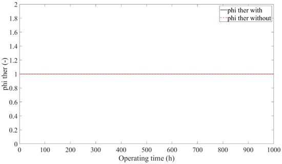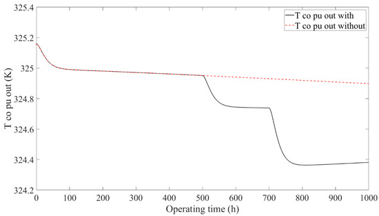 The results of the pump outlet temperature with and without the proposed control framework are shown in Figure 23. The coolant temperature of the pump outlet with/without the proposed control framework showed a decreasing trend. Specifically, the coolant temperature of the pump outlet with the proposed control framework slowly decreased from 325.16 K to 324.85 K in 0~500 h, decreased from 324.85 K to 324.74 K in 500~700 h, decreased from 324.74 K to 324.36 K in 700~832 h, and increased from 324.36 K to 324.38 K in 832~1000 h, while that without the proposed control framework decreased from 325.16 K to 324.90 K in 0~1000 h.