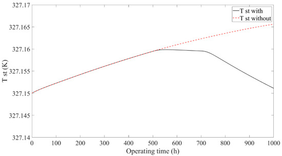 The results of the stack temperature with and without the proposed control framework are shown in Figure 24. The stack temperature with/without the proposed control framework was very close because the power level of the stack was low, so the heat production was not obvious enough, but the change trend of the stack temperature could reflect the control effect. If the stack temperature increases, the control strategy cannot pull the stack temperature back to the desired temperature, which indicates that the control strategy is unable to control the stack temperature for a longer period of operation or in the case of a high output power of the stack. On the contrary, if the stack temperature shows a rising and then falling trend, the control strategy can bring the stack temperature back to the desired temperature, which indicates that the strategy can still control the stack temperature for a longer period of operation or in the case of a high output power of the stack. The stack temperature with the proposed control framework showed a trend of increase and then decrease, while that without the proposed control framework showed a constant increasing trend. Specifically, the stack temperature with the proposed control framework rose slowly from 327.15 K to 327.16 K in 0~530 h, was basically maintained at 327.16 K in 530~711 h, decreased slowly from 327.16 K to 327.15 K in 711~1000 h, while that without proposed control framework increased from 327.15 K to 327.15 K in 0~1000 h, and then increased from 327.15 K to 327.15 K in 711~1000 h and 327.15 K to 327.17 K in 0~1000 h.
