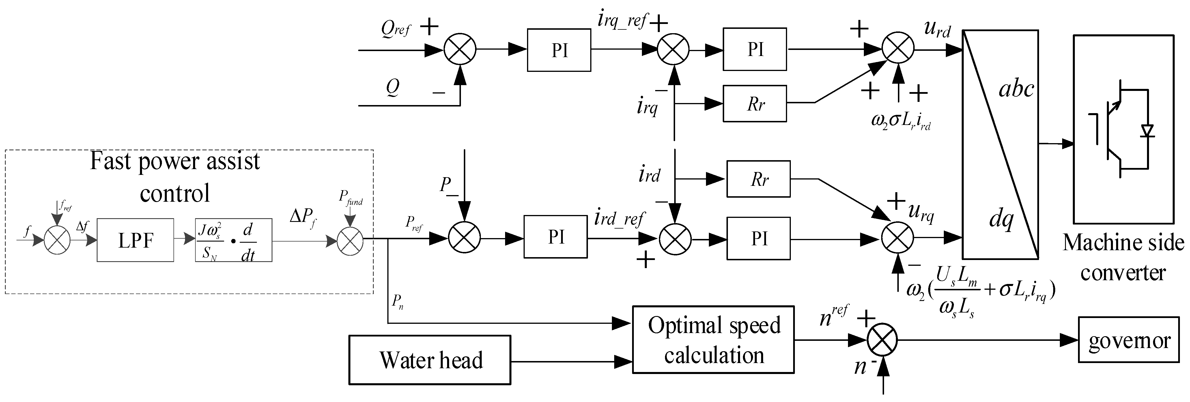 - Tan, X.; Li, C.; Liu, D.; Wang, H.; Lu, X.; Zhu, Z.; Xu, R. Stability analysis and singular perturbation model reduction of DFIG-based variable-speed pumped storage unit adopting the fast speed control strategy. J. Energy Storage 2024, 87, 111340. [Google Scholar] [CrossRef]