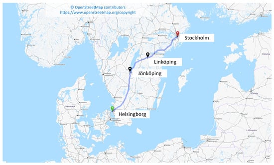 The traffic flow, i.e., the charging demand used in the simulations, is very similar to the flow used in Ref. [21] and found by the same method (involving some randomness). The traffic flow is meant to represent the traffic of long-haul trucks on a typical weekday along road E4 in the case of full electrification. The flow consists of 4355 trucks, each with a usable battery capacity of 500 kWh. Each truck has a transport task between two of the following cities: Helsingborg, Jönköping, Linköping, and Stockholm—see Figure 1. In the simulations, the road is considered a one-dimensional line with the origin placed at Helsingborg. The fact that the full road network is not considered can on the one hand seem like a weakness for the completeness of the model, but this simplification was necessary to limit the scope of the paper and to make it more comparable to Ref. [21]. Also, the method for finding the traffic flow developed in Ref. [21] takes the larger connecting roads into consideration when finding the traffic flow. Each truck has an individual start state of charge (SoC) and a required SoC at its destination. Most of the trucks will charge once during their trip, some will charge twice, and some trucks will not charge at all. A more detailed explanation of the simulated flow, and the method to generate it, is found in [21].