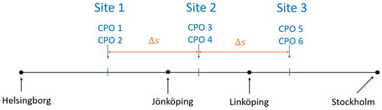 There are charging sites along the road, at each site there are two competing CPOs, and the distance between each site is . The two CPOs at sites closest to the origin (Helsingborg) are called CPO 1 and CPO 2, the CPOs at sites at a distance away are called CPO 3 and CPO 4, and so on; see Figure 2 for an example with three charging sites. In this paper, all the chargers deliver a power of kW during a charging session to all trucks regardless of SoC. Typically, this requires 900 kW chargers and implies that a truck will charge its whole usable capacity in 43 min. Notice that, in this paper, each CPO is in competition with all the others. In reality, it is likely that there is cooperation between some CPOs with the same owner.