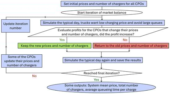 Notice that the investigated day will be simulated many times during one simulation—i.e., the simulation of the typical day will be iterated many times. The CPOs will have the opportunity to adjust their prices and the number of chargers between the iterations. The goal is to study prices and queues among other variables after a sufficiently long time of competition such that the market may converge to an equilibrium. Still, there is no guarantee that the market ends up in a true steady state. It may also converge to a quasi-equilibrium, with repeated, small variations around an equilibrium state.