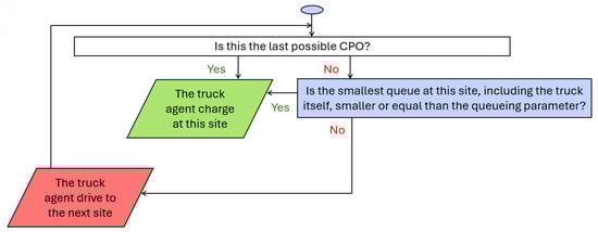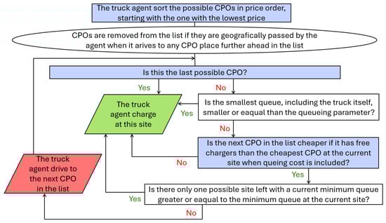 In the first case, where the trucks are sensitive to prices, each truck sorts the possible CPOs in order after the lowest price and aims to charge at the site with the CPO first in this list. This is possible since the trucks in advance of the typical day know the price at each CPO at each hour, their departure time and place, their speed, and the location of the CPOs. For the sake of clarity, CPOs that are passed when a truck is aiming for the CPO associated with the lowest price will be removed from the list as well as the CPOs that are passed if the truck eventually aims for the CPO associated with the second-lowest price and so on—i.e., the truck never turns back in order to find a CPO. This behaviour means that they can drive past a site with free chargers, attracted by a lower price further down the road. When reaching the site of the CPO with the lowest price they will make the decision of whether they should charge there or not. If they do not have the opportunity to drive further, they will charge there (they might be running low in SoC or this is the last site before their destination). However, if they have other possible sites further on, they will stay and charge at this site only if the smallest queue at one of the two CPOs is smaller or equal to the queuing parameter, . The queues that affect the decision include the truck that makes the decision. The queuing parameter is set to 0.5 queuing trucks per charger in all the simulations, which corresponds to an expected queuing time of 5 min. If the queue is considered too long, the truck will check the price at the next site in the sorted list—i.e., whether the site with the lowest price further down the road is cheaper than the current CPO when including the queuing cost, as in Subsection 3.4 in Ref. [23], assuming that the CPO at the next site has free chargers. If not, the truck will charge at this site. Otherwise, the truck will continue to the next site, with one exception. The exception is when the truck only has one more possible site to charge at and the current minimum queue at this site is greater than or equal to the smallest queue at the current site. In that case, it is considered too risky to continue to the last possible site. One may truly argue that the queue may turn out to be smaller when the truck arrives at the last site, but it is also possible that the queue is even worse. If a truck charges twice, it first minimises the price for the first charge independent of the next charge, and then minimises the price for the second charge in the same way as described above. In this paper, the behaviour described above is referred to as price-sensitive behaviour. A flowchart of how the price-sensitive trucks select charging sites is given in Figure 4.