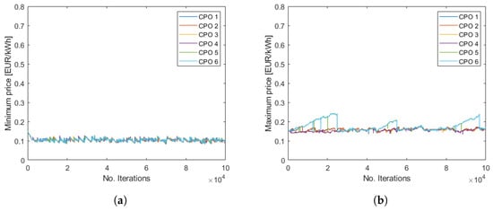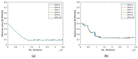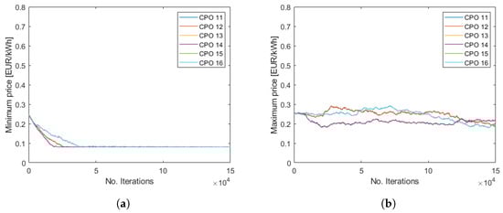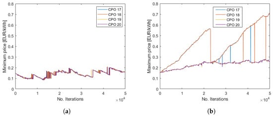 How the price develops over the iterations for the CPOs. (a) The minimum price throughout the day. (b) The maximum price throughout the day.