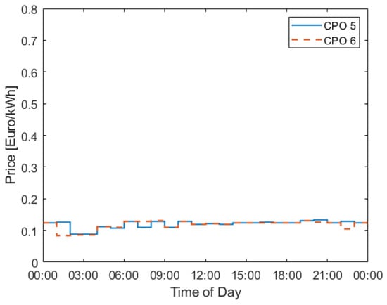 In Case 1, there are ten charging sites, and the trucks have price-sensitive behaviour (described in the previous section). The initial number of chargers was set to five for each CPO and the initial price, over the whole day, was set to 0.4 EUR/kWh. The model was run for iterations. Figure 6 shows how the minimum and maximum prices over the day develop over the iterations for some of the CPOs. The other CPOs have similar prices. Notice that there is only a small difference in price between the lowest and highest price—thus, the price is quite even throughout the day. Also, notice that the highest price is quite low, far below 0.2 EUR/kWh. Figure 7 shows how the price varies over the day for CPO 5 and 6 for the last iteration. Figure 8 shows how the system mean price and the total number of chargers in the system develop over the iterations. The system mean price is in this article calculated by dividing the total charging cost for the trucks with the total amount of energy delivered to the trucks during the typical day and is not the mean value of the 24 hourly prices. As seen from Figure 8, the searched quasi steady state (defined in Ref. [23]) seems to have been reached at the end of the simulation. Therefore, the following result is obtained by averaging over the last 1.5 iterations. The mean price in the system is found to be 0.113 EUR/kWh, the total number of chargers in the system is 89, the time-utilisation for the chargers in the system is found to be 68% (i.e., the mean charger is used 68 % of the time), the total profit for the CPOs is found to be 7770 EUR/day, the mean queuing time per charge is 8.2 min, and the worst total queuing time for one truck for the typical day was 102 min (the truck might charge twice).