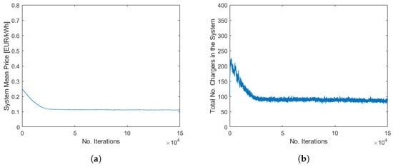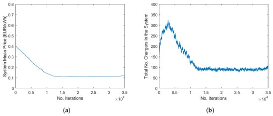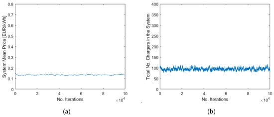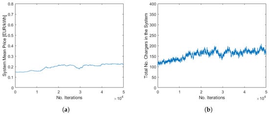 In this case, there is often a significant difference in price between the lowest and highest level. Figure 9b shows that the highest price for CPOs 17 and 18 tends to be very high and around 0.7 EUR/kWh for the last iteration. However, the price is only that high for one hour while the rest of the hours have significantly lower prices—see Figure 10a, which shows the price throughout the day for the last iteration. Figure 10b shows the number of queuing trucks per charger throughout the day for the last iteration for CPO 17 and CPO 18. Although the queuing conditions could rapidly change with the iterations at a specific site, the figure shows that there is a small lack of chargers during the hour when the price is high. The queue consists of only one truck. Since the price was equal between the two CPOs for this hour, the arriving truck that could not find a charger selected CPO 18 due to its having more chargers than CPO 17. CPO 18 had six chargers this iteration and CPO 17 only had four. Therefore, a truck would choose CPO 18 since that means standing in a queue with fewer queuing trucks per charger. The figure shows that the queue is at lunch time; however, this is not true in general. At other sites, the rush hours can be at other times. As seen from the figure, the queuing problems are small for this site and specific iteration, which is also valid for all the sites during iterations in the quasi-steady state. Figure 11 shows how the system mean price and the total number of chargers in the system develop over the iterations. As seen from Figure 11, the searched quasi-steady state seems to have been reached by the end of the simulation. Therefore, the following result is averaging over the last 1 iterations. The mean price in the system is found to be 0.225 EUR/kWh, the total number of chargers in the system is 175, the time utilisation for the chargers in the system is found to be 35%, the total profit for the CPOs is found to be 97,100 EUR/day, the mean queuing time per charge is 0.1 min (6 s) and the worst total queuing time for one truck for the typical day is 21 min (the truck might charge twice).