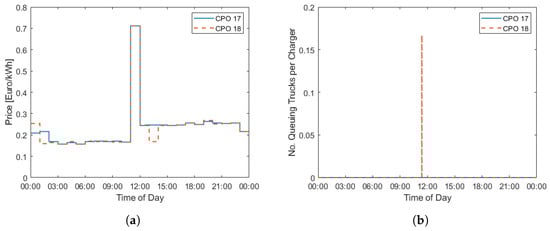 Prices and queues for one charging site during the last iteration. (a) The price throughout the day. (b) The number of queuing trucks per charger throughout the day.
