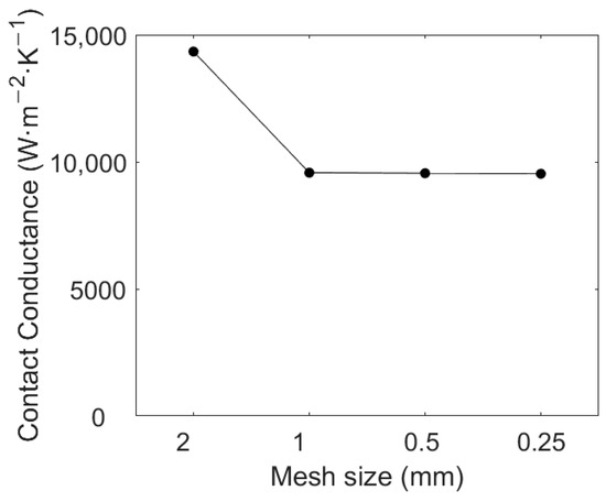The simulation is performed iteratively. An initial TCC is assumed at the interface, and the contact pressure is obtained given and q. The simulation is then repeated with the updated TCC until the solved pressure and TCC match Equation (1). A mesh independence study is presented in Figure 2, at × W/m2 and K under outward heat flow. Based on the result, a mesh size of 0.5 mm is adopted for all following ABAQUS simulations.