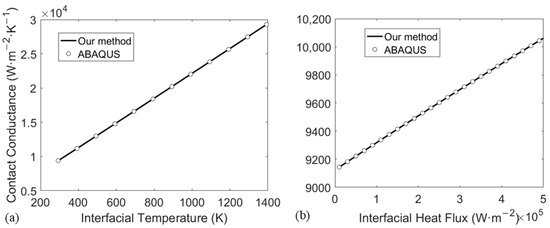 Our method is benchmarked against ABAQUS 2023. For a stainless steel/molybdenum composite cylinder under outward heat flux, is computed at varying interfacial temperatures and interfacial heat fluxes q. The parameters are the same as those described in Section 2.4. Since ABAQUS does not have a built-in accurate computation method for contact conductance, Equation (1) is also adopted in our ABAQUS simulation. Thus, the benchmark essentially validates our coupled method without quantitatively validating Equation (1). Given the qualitative focus of this work, such benchmark is sufficient for ensuring that our method accurately captures the general response patterns: Equation (1) is a commonly used model, and the choice of parameters in Equation (1) and even the specific model do not significantly impact the qualitative results, as will be discussed in Section 3.2.