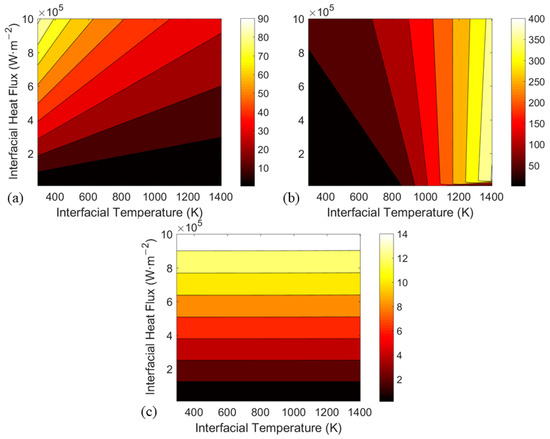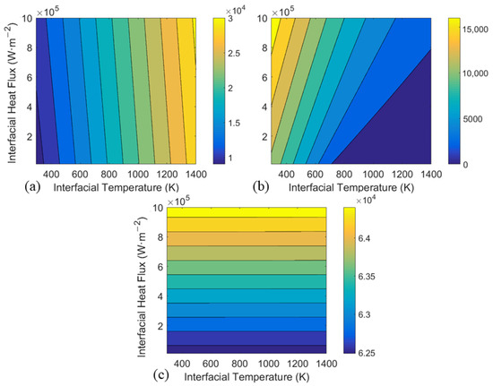 First, we investigate cases with radial-outward heat flow. Figure 5 illustrates the contour of computed thermal contact conductance against interfacial temperature and heat flux q for SS-Mo, Mo-SS, and Mo-Mo composite cylinders. Figure 6 is the corresponding contour of the computed interfacial temperature jump. For each material combination, TCC is monotonic with temperature and heat flux: it always increases with heat flux, whereas with temperature, it may increase or decrease depending on the specific material combination. We will show that these three contours computed from specific sets of parameters actually represent three general response modes for arbitrary material combinations, as long as heat flows outwards. Please note that since is proportional to in Equation (1), the contours of also reflect the patterns of contact pressure.