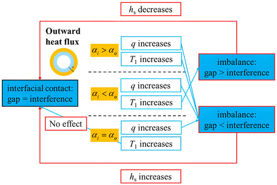 Intuitively but not rigorously, we can understand the general response modes as follows: the expansion of the outer cylinder moves it away from the interface, loosening the contact and thus decreasing , while the expansion of the inner cylinder increases for the opposite reason. When q increases, the temperature gradient along the heat flow path increases, and because heat flows outward, the inner cylinder will experience a greater temperature rise. Therefore, the net effect is the expansion of the inner cylinder, leading to larger . When increases, the cylinder with the larger expansion coefficient will dominate the net effect. For example, when is larger, the net effect is the expansion of the inner cylinder, and increases.