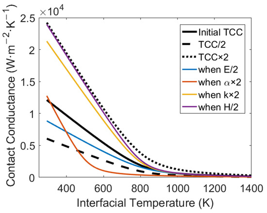 We conclude this section by discussing how the inclusion of gas gap or temperature-dependent thermo-physical properties affects the response mode. With gas gap conductance , the term in Equation (14) changes to . In many previous works [23,24], the gas gap width is the only variable that may change when q and change. For two surfaces in contact, the microscopic gap width is often set to be constant, depending only on the surface properties. A resulting constant surely will not alter the general response modes regardless of the heat flow direction. In addition, from the results obtained in our study (including those in Section 3.2 under inward heat flow), when the temperature changes from 293 K to 1400 K, TCC typically changes by over 200% or −80%, except when the cylinders are made of the same material, where the impact of differential thermal expansion is minimized. While more advanced models that include the effects of temperature on gas gap conductance exist, the variance in these models is relatively insignificant compared to the effect of differential thermal expansion in many cases. Therefore, for the simplicity of computation and analysis, and given the qualitative focus of this work, the gas gap conductance is not considered. In terms of temperature-dependent thermo-physical properties, sensitivity analyses at × W/m2 regarding individual thermo-physical parameters in Figure 8 show that in most cases, changes in these parameters (such as doubling or halving their values) cause the TCC to remain within a range of approximately twice or half of the initial TCC. Few thermo-physical properties undergo changes in magnitude similar to those of the TCC over this temperature range, so the qualitative response patterns are unaffected in these cases. Moreover, while certain cases could see an impact from temperature-dependent properties—such as when materials have very similar or identical expansion coefficients (minimizing the differential thermal expansion) or when specific parameters change dramatically with temperature—these effects are material-specific. For instance, the thermal conductivity may increase with temperature for one material but decrease for another. This study intentionally excludes such cases to focus on general response patterns. Our approach can be considered to be analyzing response patterns that are decoupled from temperature-dependent properties, allowing for generalization. These patterns are directly applicable to many cases where the impact of temperature-dependent properties is not significant. When the impact is substantial, material-specific effects can be incorporated to yield a more complete picture.