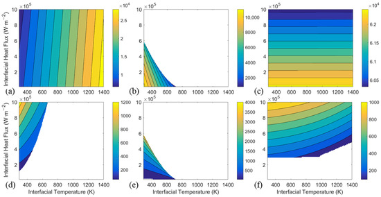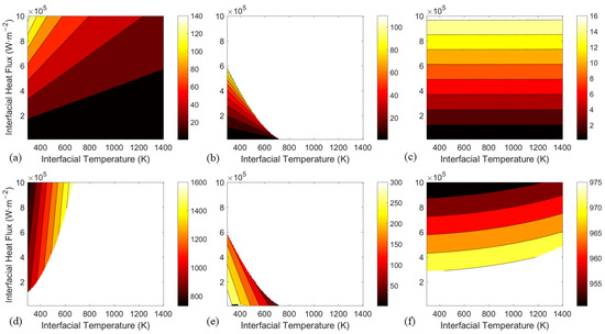 Numerically computed contours of thermal contact conductance against interfacial temperature and heat flux q for (a,d) SS-Mo, (b,e) Mo-SS and (c,f) Mo-Mo composite cylinders, under inward heat flux. The blank parts on the contours indicate that the cylinders have lost contact. Two solutions of can coexist for the same material combinations, and (a–c) shows the contours of the larger solution. These six contours computed from specific sets of parameters can be proven to represent six general response modes for arbitrary material combinations under inward heat flux.