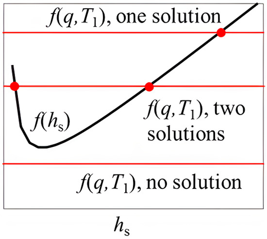 The only difference between this equation and the previous one for outward heat flux is the reversed sign of and q · . This alone can mathematically explain the additional solution of . Let us refer to the left side of the equation as , and the right side as . For fixed q and , always increases monotonically with in the case of outward heat flux, but under inward heat flux, first decreases to a minimum value and then increases as goes from zero to infinity. This non-monotonic trend allows for at most two coexistent solutions, as illustrated in Figure 11 with the black curve representing and the red lines representing .