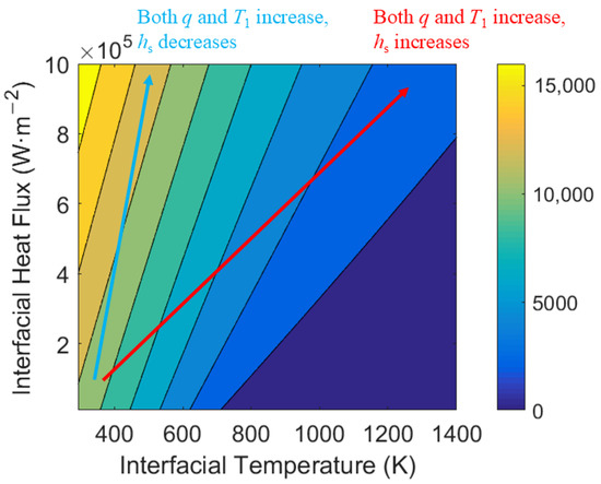 The contour of for Mo-SS system under outward heat flow, as in Figure 3b. The red and blue arrows both represent the simultaneous increase of q and , but the resulting response of is opposite.
