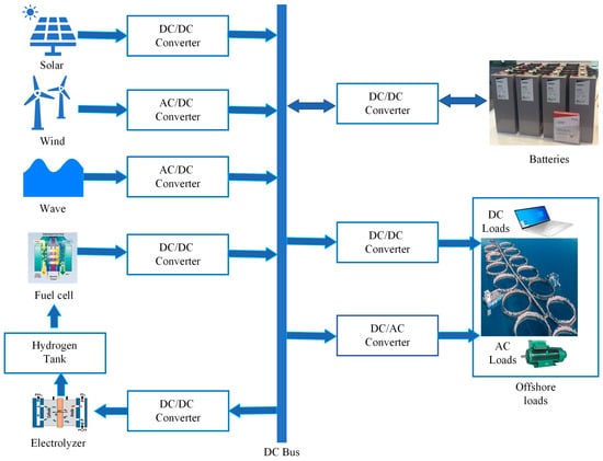 A typical DC MG system suitable for remote communities and offshore industries is illustrated in Figure 1. The organisation of DC MGs for specific applications is decided by the required power capacity, the accessibility of DRESs, and ecological conditions. It may vary depending on the applications. Solar cells, wave energy converters, wind turbines, and fuel cells can all perform as potential power sources in DC MGs. Hydrogen can be produced using an electrolyser, stored in tanks, and used by the fuel cell to generate energy. Additionally, hydrogen can be stored for extended periods and exported for use in other applications such as hydrogen fuel-based vessels and industries.