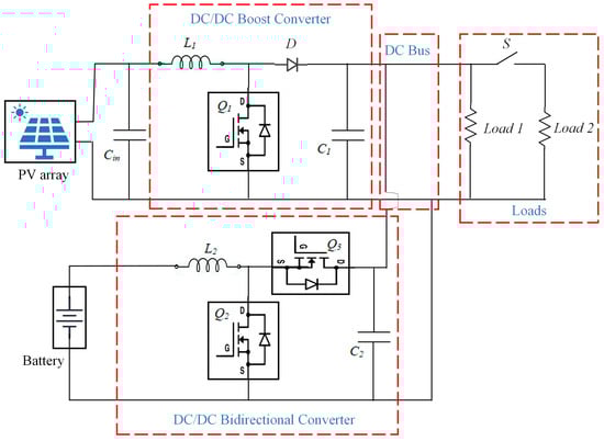 A basic DC MG with a PV panel, a battery, and many loads is shown in Figure 2. A DC-DC boost converter interfaces the PV panel with the DC bus, utilising a maximum power point tracking algorithm (MPPT) to optimise electricity generation from solar energy under varying sun irradiance. The DC bus is connected to the battery through a DC-DC bidirectional power converter. A controller is an important part of this setup because it controls the bidirectional converter’s output voltage to keep it within a certain range and keep the system stable.
