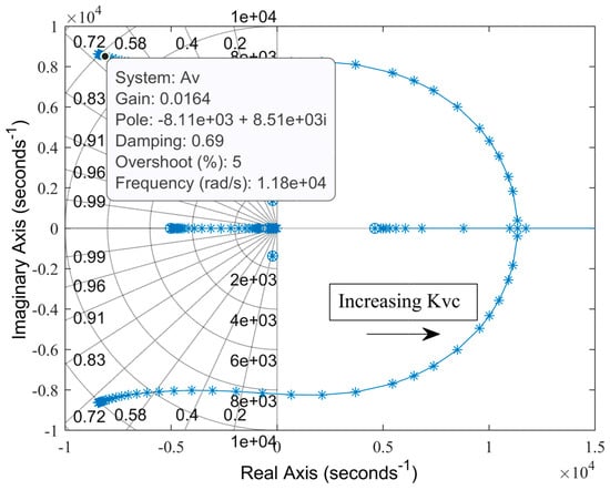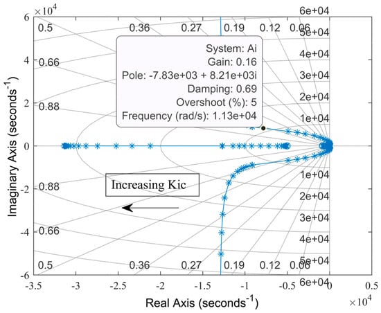 The gain of the current compensator (Kic) is tuned to optimise dynamic responses, including rise time, settling time, peak time, and percentage overshoot. The frequency response is analysed through a Bode plot to determine the desired phase margin, gain margin, and bandwidth. Initially, considering the inner current control loop (Ai), a root locus is illustrated in Figure 5 to facilitate the selection of Kic.