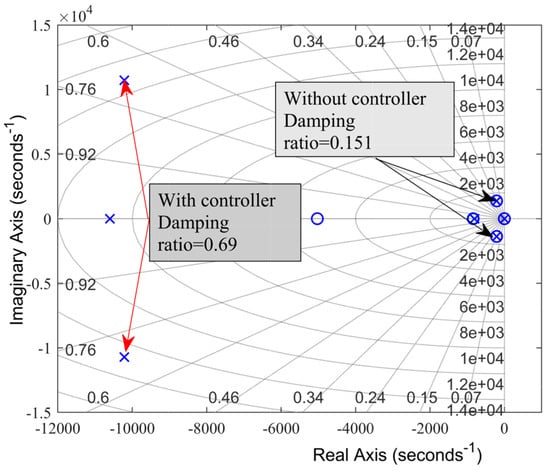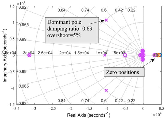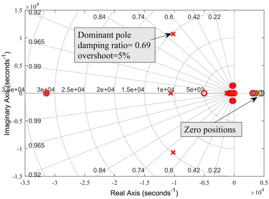 Dominant poles significantly influence critical performance metrics such as settling time, peak time, percentage overshoot, and system stability. Initially, the dominant poles of the current response are positioned close to the imaginary axis, resulting in a very low damping ratio of 0.151, which indicates a narrow stability margin. As depicted in Figure 7, after applying the current compensator, the dominant poles shift farther from the imaginary axis. This adjustment substantially increases the damping ratio from 0.151 to 0.69, enhancing the system’s stability and response characteristics.