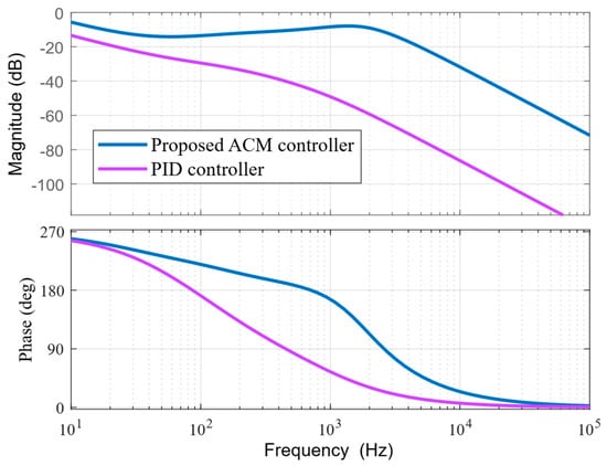 Figure 8 and Figure 9 illustrate the superior performance of the ACM-based cascaded controller in terms of transient and frequency response in comparison to the conventional PID controller. Specifically, Figure 8 demonstrates that the system utilising the ACM-based controller significantly outperforms the conventional PID controller in terms of convergence speed. The proposed ACM-based controller settles the DC bus voltage to its reference value in 117 ms, significantly faster than the conventional PID controller, which takes 274 ms, demonstrating superior dynamic performance. Figure 9 highlights that the ACM controller’s magnitude and phase responses consistently exceed those of the conventional design across all frequencies, underlining the effectiveness of the ACM-based cascaded controller. The Bode plot shows that the proposed ACM-based controller yields a significantly improved bandwidth of 35 Hz compared to only 14 Hz with the conventional PID controller, indicating better dynamic response and faster disturbance rejection. Table 1 details the system performance metrics for both PID- and ACM-based cascaded controllers, showing that the ACM-based controller significantly reduces rise time and settling time with increased bandwidth.