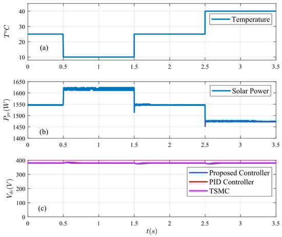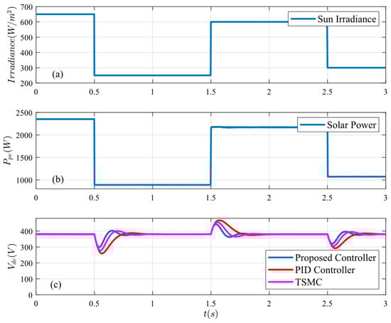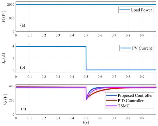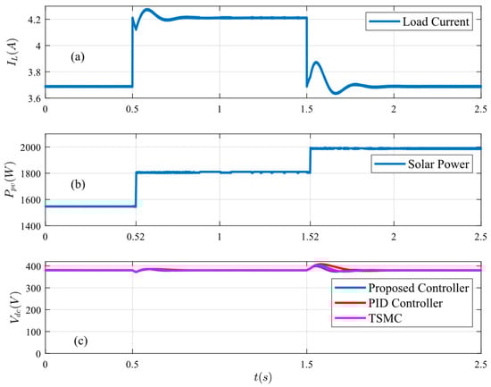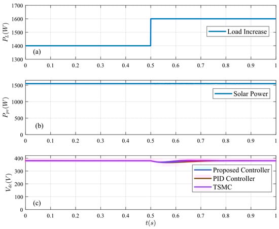 Figure 10a illustrates a scenario to observe the small-signal stability where the load increases by 10% at t = 0.5 s, while PV power remains constant at 1.5 kW, as shown in Figure 10b. Under these conditions, the proposed controller stabilises the DC bus voltage at 380 V within 67 ms following the load variation, compared to 152 ms with the conventional PID controller and 100 ms with TSMC, as illustrated in Figure 10c.