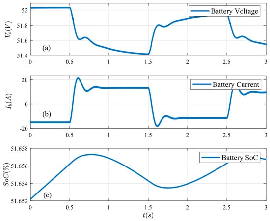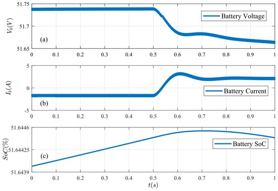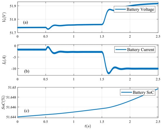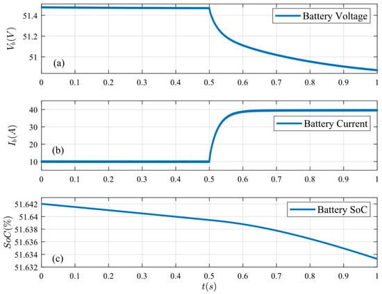 Battery conditions under load increase: (a) battery voltage, (b) battery current, and (c) battery SoC.