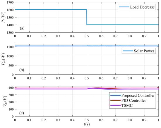 System response under load decrease: (a) load power, (b) PV power, and (c) bus voltage.