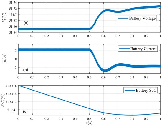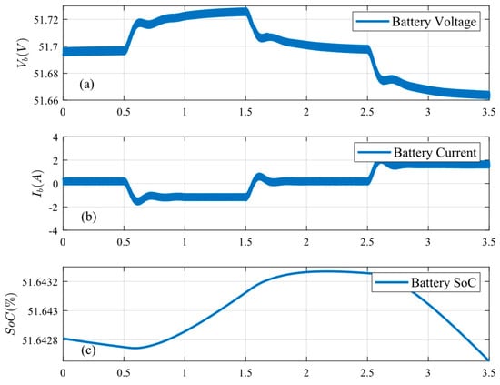 Figure 11 displays the voltage, current, and SoC of the battery as the load increases. Initially, the solar system generates more power than the load requires, allowing the battery to absorb excess power through charging. At t = 0.5 s, the demand increases from 1.4 kW to 1.6 kW, prompting the battery to discharge and provide additional power to the load, thereby maintaining the balance between generation and demand. In this case, the battery voltage and current ripple are 0.005 V and 0.45 A, respectively, at the switching frequency.