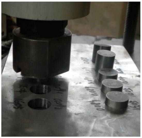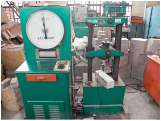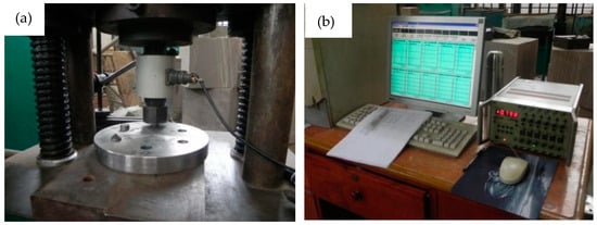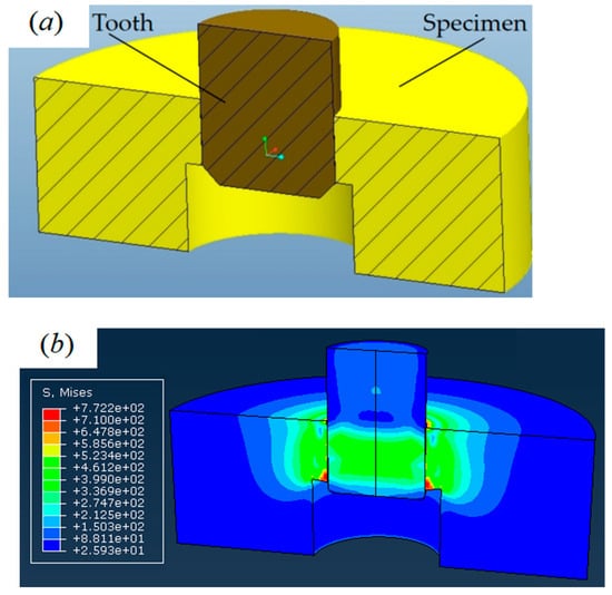 In this experiment, a hydraulic universal testing machine (as shown in Figure 3) is used to complete the loading process. The hydraulic universal testing machine model AG-IS 100 kN, with a maximum test pressure of 100 kN and an accuracy level of 0.5, is suitable for testing the mechanical properties of various materials such as tension, compression, and bending. It is manufactured in Taizhou City, Jiangsu Province, China. A pressure sensor is threaded onto the indenter of the press, and the displacement of the indenter is monitored by a displacement sensor. Both sensors are connected to a computer with data acquisition capabilities, enabling real-time acquisition and storage of pressure and displacement data. The tooth and the experimental specimen (tooth wheel matrix) are placed on the workbench plane, with the indenter and tooth axis always aligned in a straight line. The indenter can press into and out of the tooth through the upward movement of the hydraulic cylinder.