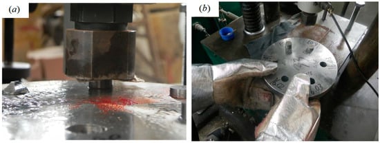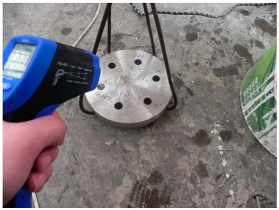 This experiment was meticulously designed and executed in strict compliance with the relevant standards of the International Organization for Standardization (ISO), particularly in material testing, mechanical property evaluation, and high-temperature environment simulation. Specific reference was made to ISO 6892-1:2019 [32], “Tensile testing of metallic materials—Part 1: Room temperature test method”. The tooth hole type employed in the fastening force test experiment is a through-hole. The experiment investigates the influence of different interference fits on the tooth-holding force at various temperatures. Specifically, the fastening force of the tooth hole is measured by applying axial loading to press the tooth out of the hole. In the experiment, tooth diameters of 16 mm, 14 mm, and 12 mm were used, with tooth hole distances of 4 mm, 6 mm, 8 mm, 10 mm, and 12 mm, respectively. Three interference fit ranges were tested: 0.065–0.085 mm, 0.085–0.105 mm, and 0.105–0.125 mm. Axial loading experiments were conducted at room temperature, 120 °C, 180 °C, and 240 °C. To eliminate experimental variability, each group of experiments was repeated five times. The temperature of the heated test piece was measured using an HT-8830 infrared thermometer, as illustrated in Figure 4.
