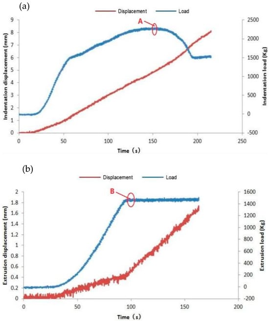 The displacement and drilling pressure curves of the teeth during pressing and extruding were obtained by the experimental acquisition system, as shown in Figure 8. During the tooth-pressing process, the maximum tooth insertion force occurs at point A, corresponding to the continuous increase in the load. In the extrusion process, the teeth initially move slightly to overcome the friction on the joint surface as the load continues to increase. Significant displacement movement begins once the maximum static friction, caused by the interference fit, is overcome. Since the contact area between the teeth and the perforations remains constant, the pressure curve stabilizes after the teeth start moving, and the load reaches the maximum fastening force at point B.