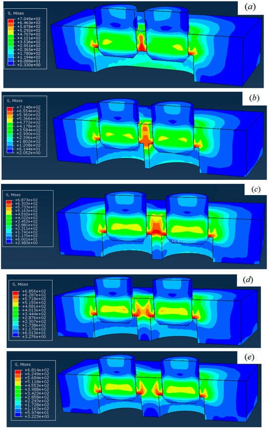 Stress cloud maps for different perforation distances: (a) 4 mm. (b) 6 mm. (c) 8 mm. (d) 10 mm. (e) 12 mm.