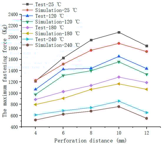 The relationship between the maximum fastening force during simulation and experimental testing, i.e., the pressure value during tooth pressing, and the perforation distance at different temperatures is shown in Figure 11. From the simulation data, it can be seen that the larger the distance between the teeth, the greater the maximum fastening force and the better the fastening effect. When the tooth pitch increases to 10 mm, the increase in surface contact pressure is most significant. This is because when the distance between adjacent teeth is too close, stress superposition during the tooth insertion process causes plastic deformation of the tooth hole material. The hole wall cannot maintain the fastening effect on the teeth, resulting in a decrease in fastening force. This is consistent with the experimental results.