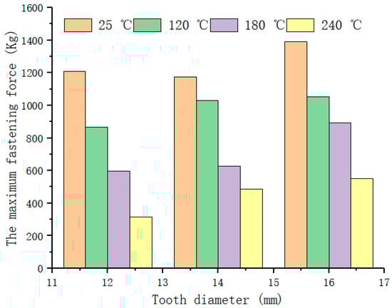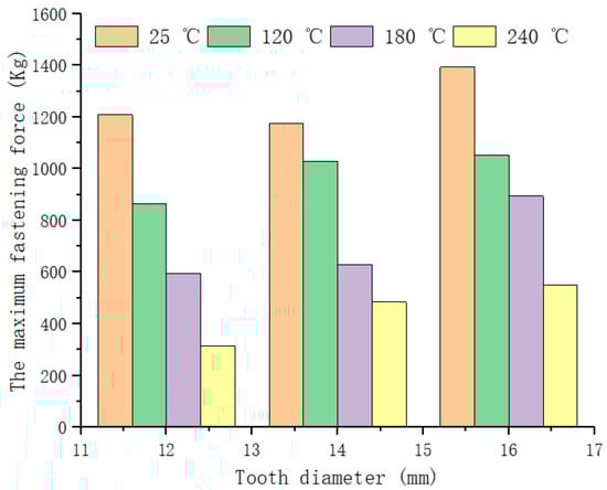 The fixation strength of different tooth diameters was analyzed under an interference fit of 0.115 mm. Figure 12 illustrates the relationship between tooth diameter and maximum fastening force at various temperatures. The fastening force consistently decreases as the temperature rises. When the tooth diameter is held constant, the tooth fixation effect is poorest at 240 °C, with the maximum fastening force decreasing by approximately 58.7–73.9% compared to that at room temperature. At room temperature, the maximum fastening force initially decreases and then increases with increasing tooth diameter, reaching a peak of 1392.8 kg when the tooth diameter is 16 mm. As the temperature increases, the maximum fastening force also increases with larger tooth diameters, peaking at 16 mm. In other words, at higher temperatures, larger tooth diameters result in better tooth fixation effects. For a tooth diameter of 16 mm, the maximum fastening forces at elevated temperatures are 1053.2 kg at 120 °C, 895 kg at 180 °C, and 549.2 kg at 240 °C, respectively.