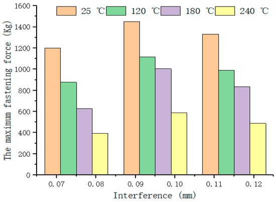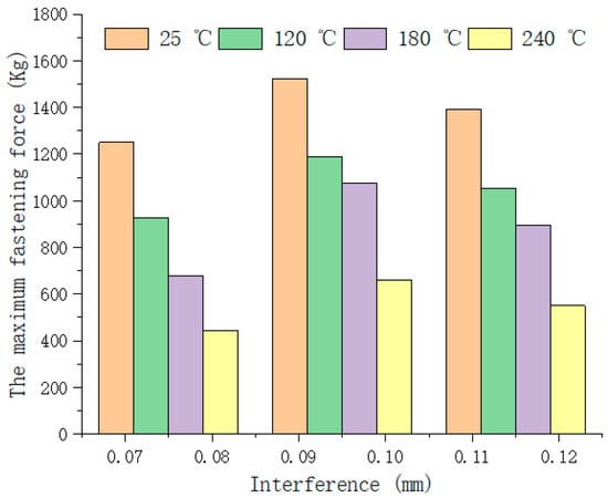 - At the same temperature, as the interference fit increases, the maximum fixed-tooth force first increases and then decreases, and the maximum fixed-tooth force is highest when the interference fit is 0.095 mm. At 120 °C, 180 °C, and 240 °C, the maximum fastening force decreased by 21.9%, 29.4%, and 56.6%, respectively, compared to room temperature.