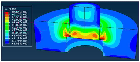 Simulation analysis was conducted on different interference amounts, and the stress cloud maps and extracted maximum stresses are shown in Figure 16 and Figure 17. It can be seen that the tooth fastening force decreases with increasing temperature, and the larger the interference amount, the smaller the maximum fastening force. This is because when the interference amount is too large, the tooth hole wall undergoes plastic deformation. The hole wall cannot maintain the fastening effect on the teeth, resulting in a decrease in the strength of the fixed teeth. This is consistent with the experimental results. The main reason for the maximum fastening force, when the interference fit is 0.095 mm, is that the contact pressure between the tooth hole wall and the teeth is moderate, providing sufficient friction and support to ensure maximum fastening force. The second is the optimization of stress distribution. An appropriate interference fit can optimize the stress distribution between the tooth hole wall and the teeth, avoiding stress concentration. A 0.095 mm interference fit can ensure more uniform contact between the tooth hole wall and the teeth, thereby improving the fastening force. The third is the matching of material properties. In high-temperature environments, an appropriate interference fit can better match the thermal expansion coefficients of the matrix material and the tooth material, thereby reducing the decrease in fastening force caused by differences in thermal expansion.