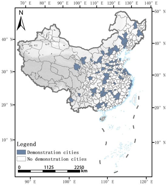 Energy transition is an important policy tool for promoting sustainable development, in which the development and utilization of renewable energy is considered a key path to reducing environmental pollution and mitigating climate change. To address global climate change, the Kyoto Protocol proposes three flexible cooperation mechanisms to achieve greenhouse gas emission reduction targets through international cooperation, one of which is the Clean Development Mechanism (CDM) []. As one of the world’s largest carbon emitters, China has prioritized clean energy development and positioned carbon reduction as a cornerstone of its national strategy. Intending to effectively address environmental and climate change issues and implement the goals of the 12th Five-Year Plan for Renewable Energy Development, the Chinese government introduced the concept of “New Energy Demonstration Cities” in 2012. This policy framework seeks to embed energy supply and consumption into the core of urban planning by deeply integrating new energy systems with urban construction. Its objectives are to foster the development of new energy industries and technological advancement, optimize the urban energy consumption structure, and gradually phase out the traditional “high-energy consumption, high-emission, high-pollution” economic model—all with the aim of enhancing cities’ sustainable development capabilities []. It will gradually get rid of the traditional economic development model characterized by “high energy consumption, high emission, and high pollution” and enhance the sustainable development capability of the city. The declaration mechanism of new energy demonstration cities is characterized by both “top-down” and “bottom-up” approaches. Specifically, the declaration process is authorized by the central government, local governments apply independently according to their conditions, and finally, the central government reviews and approves the application. According to the “New Energy Demonstration City Evaluation Indicator System and Explanation (for Trial Implementation)”, the declaring city needs to meet two basic conditions: firstly, the city’s comprehensive capacity meets the standard, and secondly, the city’s new energy utilization base meets the standard. These conditions are the prerequisites for the declaration work, ensuring that the construction of the demonstration city is scientific and feasible. The National Energy Administration (NEA) conducted a comprehensive assessment of the declared cities based on the basic conditions and evaluation index system, and in January 2014, it announced the list of the first batch of new energy demonstration cities and industrial parks []. The spatial distribution pattern of these demonstration cities is shown in Figure 1, covering representative cities in different regions of China, providing practical samples and policy references for the development of energy transition nationwide.