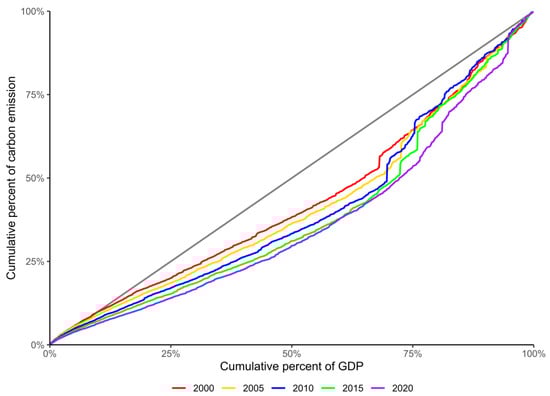 Lorenz curve: cumulative distribution of carbon emissions—cumulative distribution of GDP.