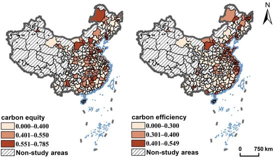 Spatial Distribution of Carbon Equity and Efficiency in Chinese Cities in 2021. Note: This map is based on the annotated map (No. GS(2023)2767) of the standard map service website of the Map Technical Review Center of the National Ministry of Natural Resources of China. The base map has not been modified.