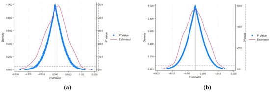 A placebo test was required to exclude the effects of other possible unobservable factors. A sample of 1000 was randomly selected from the samples, and each sample was randomly assigned to a demonstration city and a non-demonstration city. Figure 6a,b show the results for the treated group and is randomly selected 1000 times, and the kernel density of the regression coefficients is all around 0 and normally distributed [].