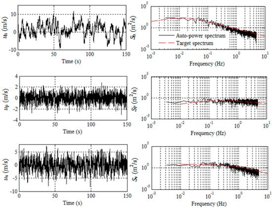 where , , and denote the along-wind, crosswind, and vertical wind spectra, respectively; n is the frequency; and represents the mean wind speed at the reference height z.