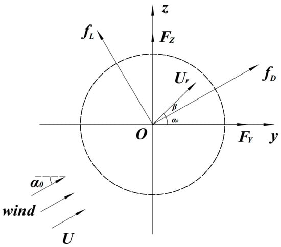 In analyzing the effects of wind load on the conductor, the additional conductor’s mass is assumed to be concentrated at a single point. A coordinate system (Oyz) is established with the center of mass O as the origin, where the horizontal direction of O is the y-direction, and the vertical direction is the z-direction, as shown in Figure 2. According to the vibration principle of flexible bridges [,], the wind load acting on the iced additional conductor will change with the dynamic windward attack angle, and the aerodynamic force is derived as follows: