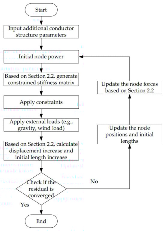 A comprehensive approach is employed to analyze wind-induced vibration characteristics, considering wind speeds of 20 m/s and 30 m/s. Given the stochastic nature of turbulence, multiple characteristic points are randomly selected along different spatial positions of the conductor, and the time domain analysis of wind-induced responses is conducted at these points. Numerical simulations are performed using MATLAB (2022), where the amplitude–frequency response characteristics of the time series data are analyzed to evaluate the influence of wind speed variations on the wind-induced vibration behavior of additional conductors. Furthermore, a detailed analysis of vibration amplitude and its time history characteristics is performed. To ensure the stability and statistical reliability of the results, a simulation time of 500 s is selected. This approach allows for an accurate assessment of the conductor’s dynamic response to wind excitation, offering valuable insights into its aerodynamic behavior and structural optimization. The iterative calculation process in MATLAB (2022) is shown in Figure 3.