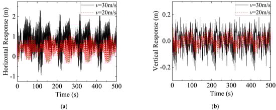 Comparison of Responses Under Different Wind Speeds. (a) Mid-span horizontal response; (b) mid-span vertical response.